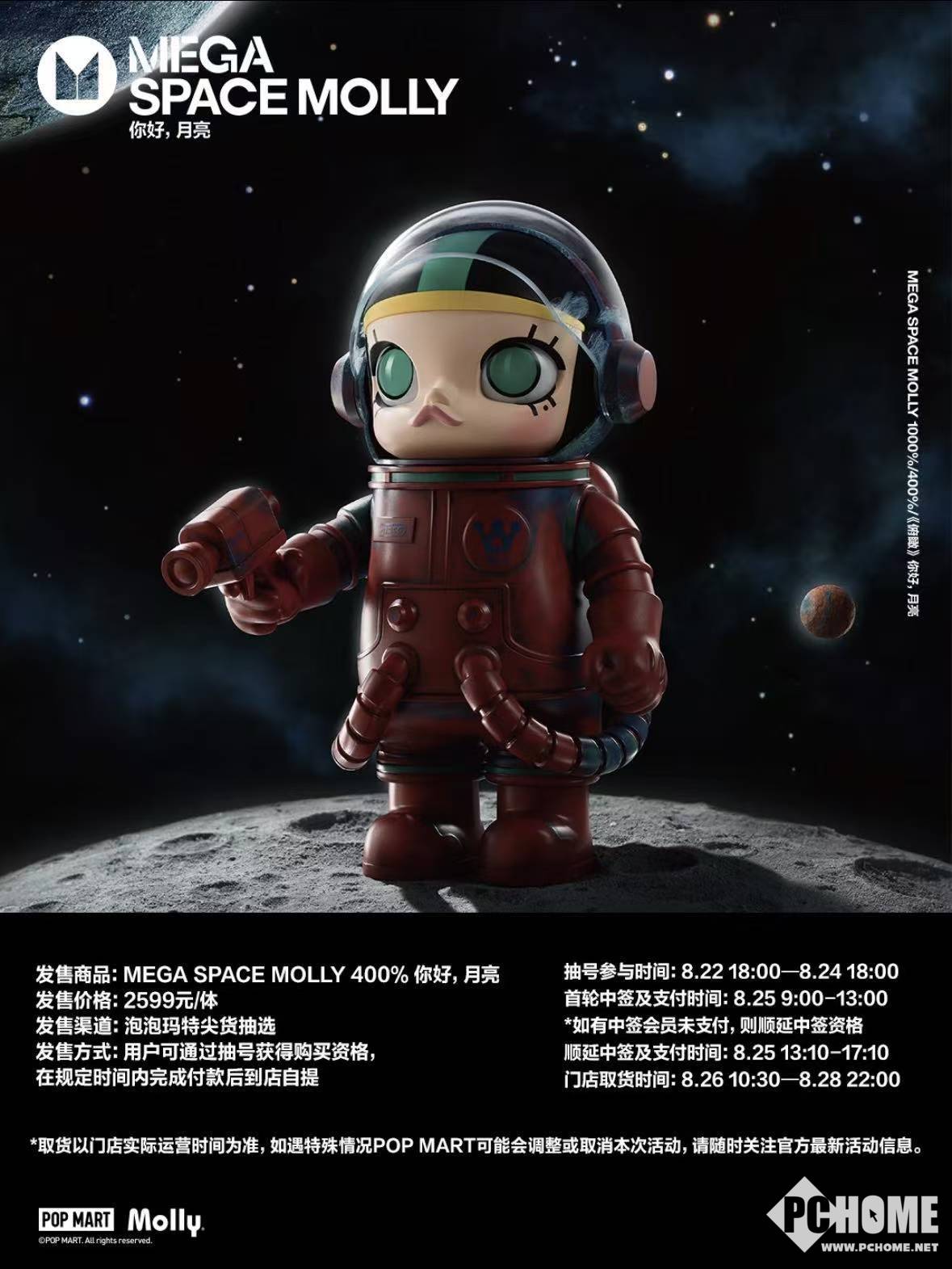 此次活动中,MEGA SPACE MOLLY 400%“你好,月亮”将通过泡泡玛特尖货抽选渠道发售,单价为2599元,用户可在8月22日18:00至8月24日18:00期间参与抽号,最终中签者方可获得购买资格。