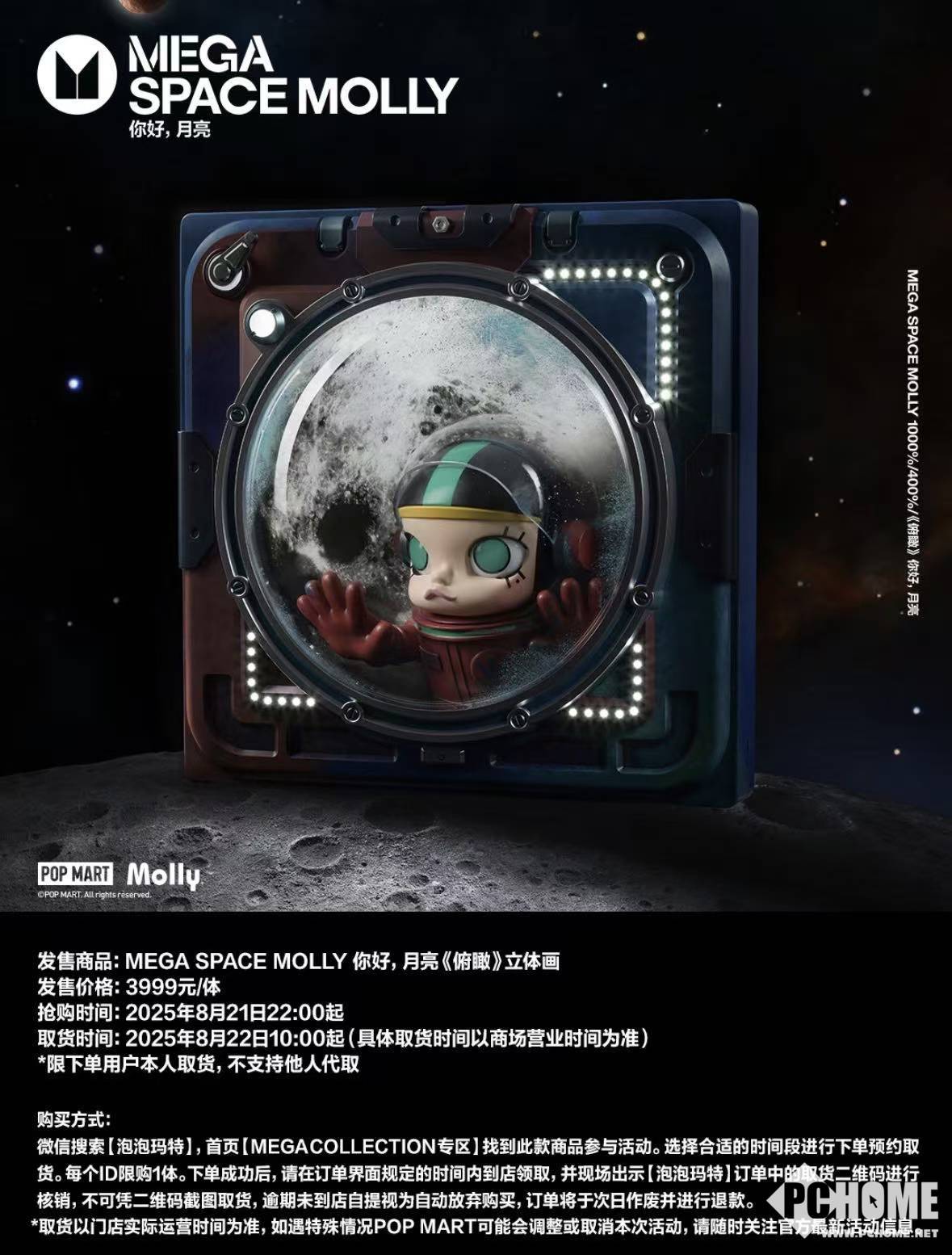除公仔产品外,泡泡玛特还将推出售价3999元的MEGA SPACE MOLLY“你好,月亮”《俯瞰》立体画。该产品将于8月21日22:00起开放抢购,消费者需凭本人订单进行现场取货,取货时间自8月22日10:00起(以商场营业时间为准)。