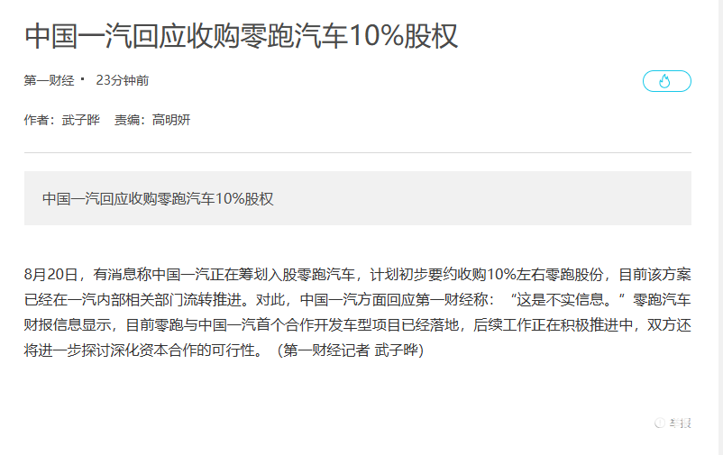8月20日,据财联社今日报道,中国一汽正在筹划入股零跑汽车,计划初步要约收购10%左右零跑股份,目前该方案已经在一汽内部相关部门流转推进。对此,中国一汽方面向回应第一财经称:“这是不实信息。”