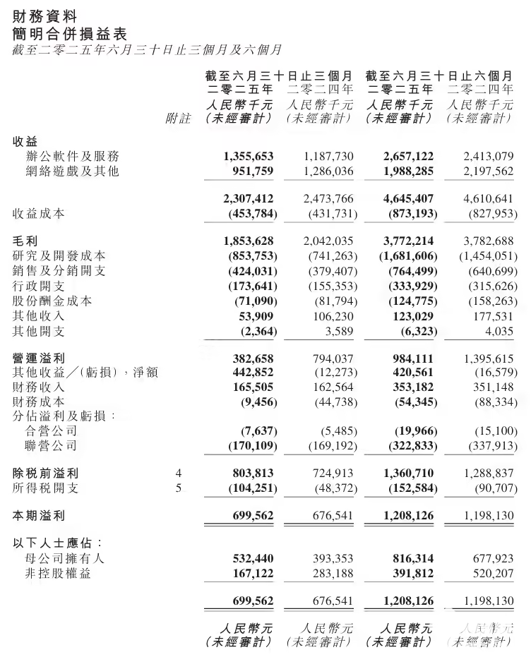 从业务板块来看,2025年上半年,金山办公办公软件及服务业务营业收入26.57亿元,同比增长10.12%,归母净利润7.47亿元,同比增长3.57%,展现出稳健的增长态势,对金山软件整体业绩有一定支撑 。而游戏业务方面,面临市场竞争加剧等挑战,收入有所下滑。收益为9.518亿元,同比下降26%,环比下降8%。同比下降主要由于二次元游戏《尘白禁区》及《剑网3》在2024年第二季度的基础较高所致。环比下降主要由于《尘白禁区》及《剑网3》的下降所致,部分被其他游戏的收益增长所抵消。