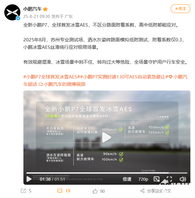 8月21日,小鹏汽车官方今日发布视频称,全新小鹏P7全球首发冰雪AES,并且不区分路面附着系数,高中低附都能应对。