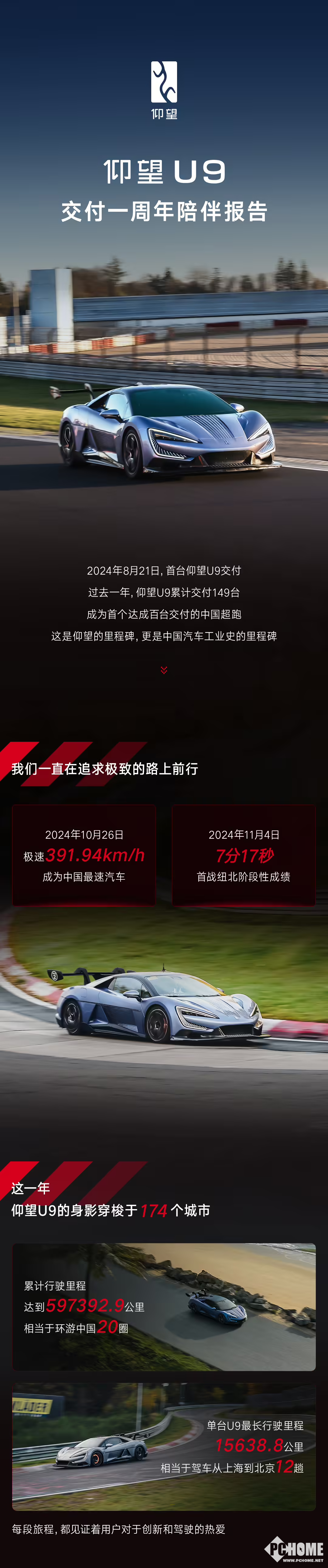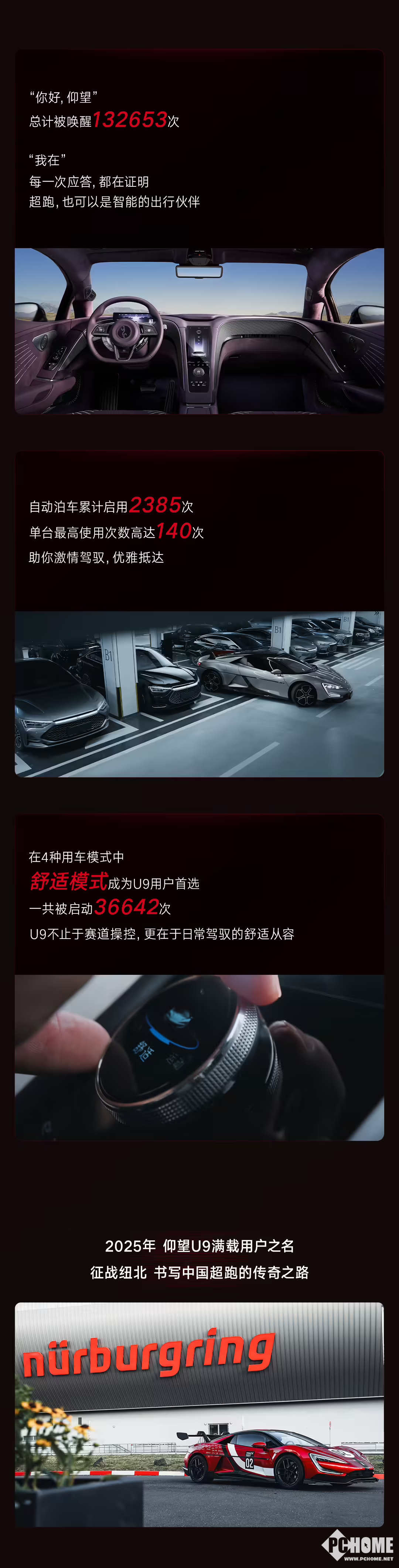 报告回顾了仰望U9在性能方面的多项突破。2024年10月26日,该车以391.94km/h的极速纪录成为中国量产车中最高速车型。同年11月4日,仰望U9首次挑战纽博格林北环赛道,跑出7分17秒的阶段性成绩。在用户使用方面,一年累计行驶总里程达到59.7万公里,相当于环绕中国约20圈,其中单车最长行驶里程15638.8公里。