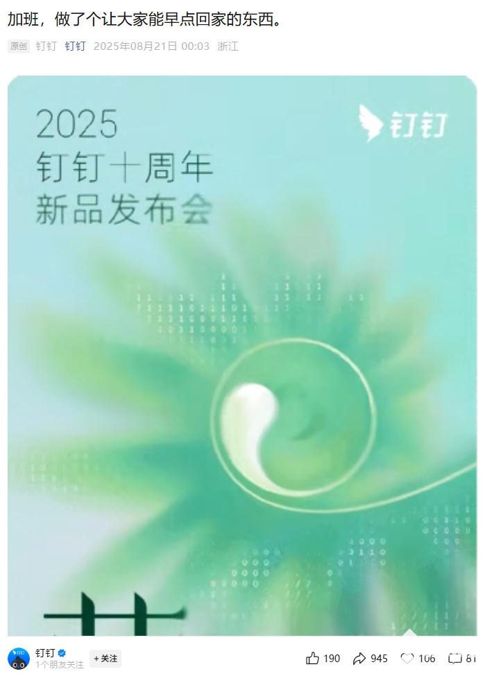 8月21日,钉钉官方公众号在今日凌晨0:03发文一篇标题为《加班,做了个让大家能早点回家的东西。》的推文。钉钉在推文中公布了2025钉钉十周年新品发布会的相关信息,同时还将会议议程和安排一并公开。
