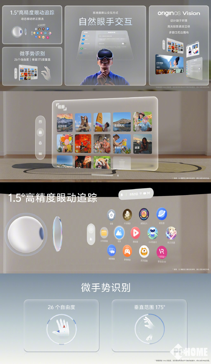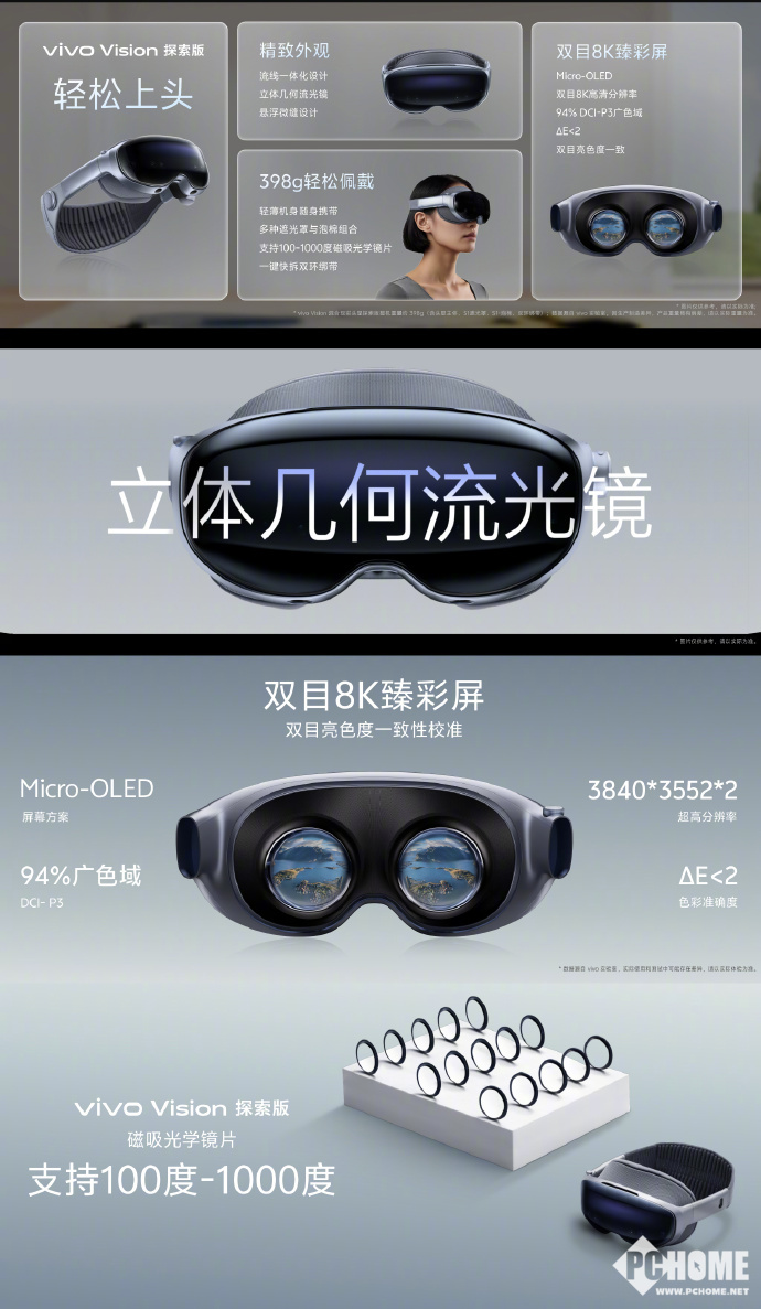 据vivo智慧终端产品总经理洪沂介绍,vivo Vision探索版的外观是流线一体化设计,正面是一块立体几何流光镜,机身“悬浮微缝”设计隐藏功能模块。重量仅398g,远轻于行业平均600g的重量,高度仅83mm、厚度40mm。在屏幕上,采用Micro-OLED双目8K臻彩屏,支持P3色域,通过双目校准,保证每台设备的两块屏幕保持一致的、专业级电影监视器的色彩容差体验,并且还为近视用户定制了从100度到1000度的磁吸镜片。vivo Vision探索版也搭载OriginOS Vision系统。还实现了1.5°高精度眼动追踪,加上26个自由度的微手势识别和垂直175度的识别范围,带来自然精准的眼手交互体验。