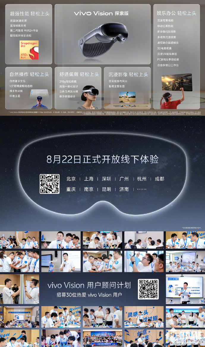 据官方介绍,8月22日起,在北京、深圳等10余座城市的12家vivo官方授权体验店,用户可抢先预约体验,后续还将开放第二批线下体验门店。还有机会通过vivo社区的招募,加入“vivo Vision顾问计划”。