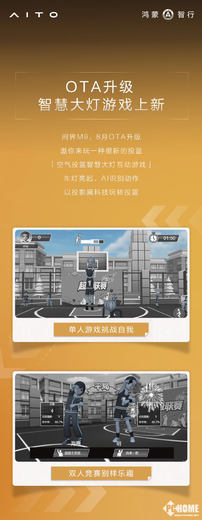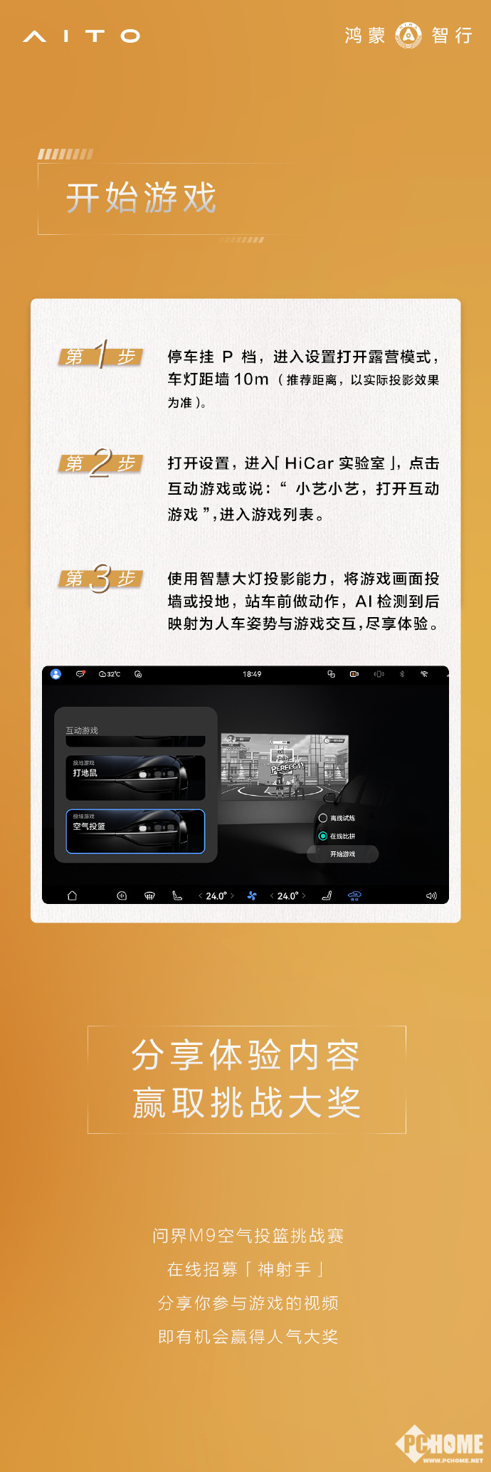 据了解,本次挑战赛依托问界M9智慧大灯的投影功能展开。用户在车辆处于停车状态下,可通过“HiCar实验室”进入互动游戏,利用大灯将游戏画面投射至墙面或地面。参与者在车前进行肢体动作,由AI系统进行识别与映射,从而完成“空气投篮”操作。这一应用场景展示了智能汽车在出行之外的娱乐拓展能力。