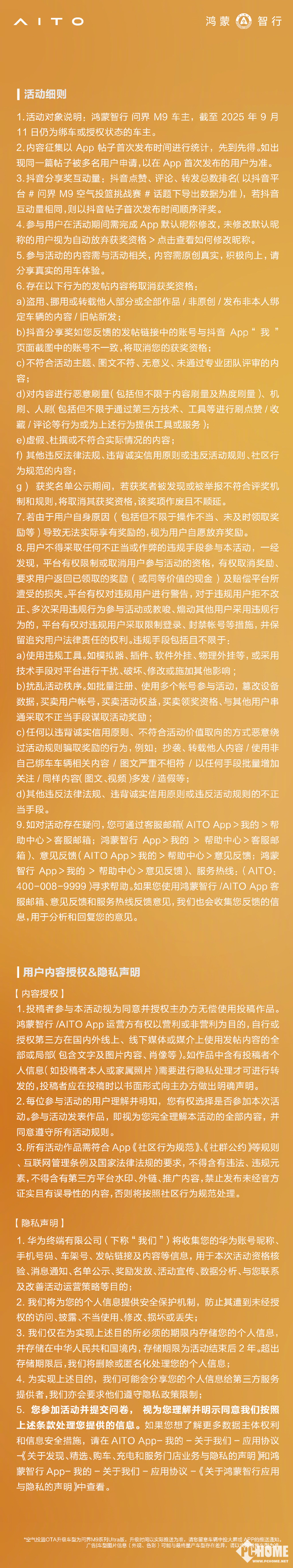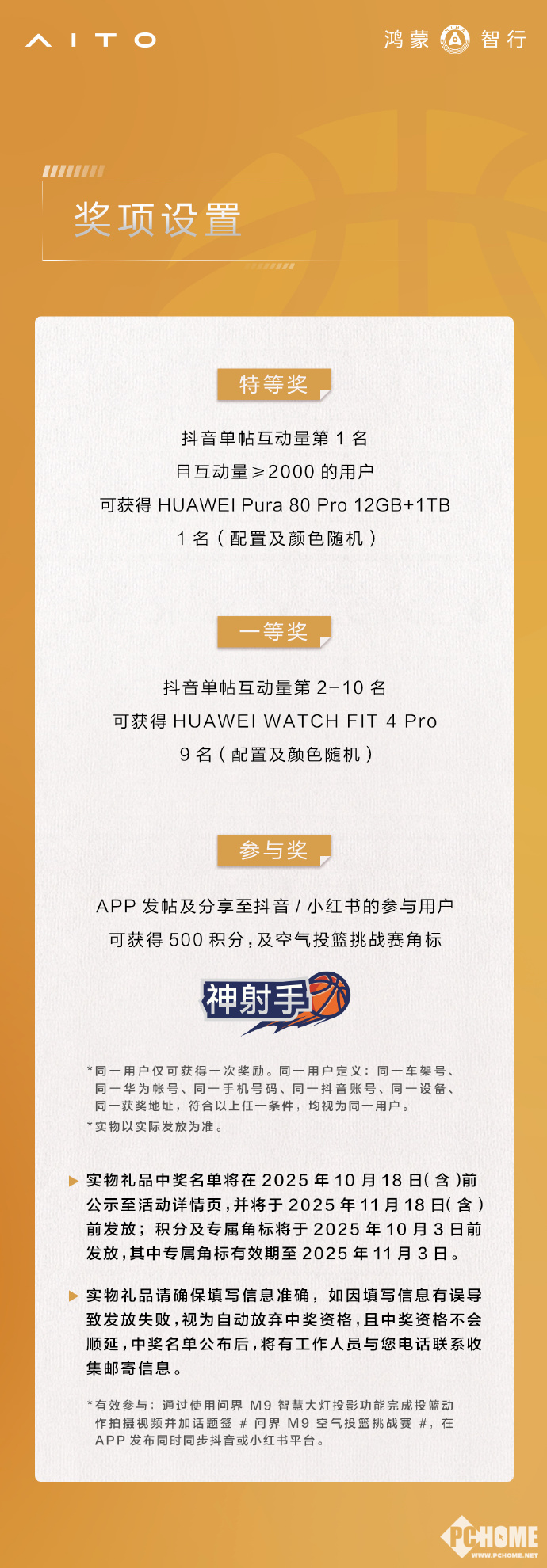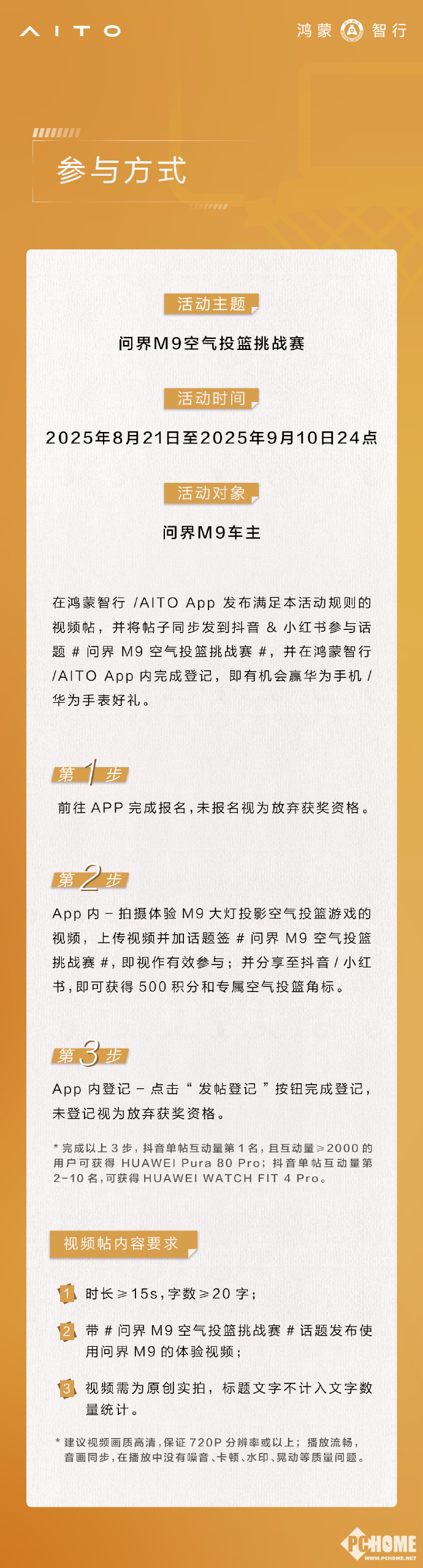 参与流程方面,用户需在鸿蒙智行或AITO App报名,并上传不少于15秒的原创实拍视频,内容需展示使用问界M9进行互动投篮的过程,并带有指定话题标签。完成登记并在抖音、小红书等平台分享即可获得积分与活动标识。最终,互动量排名靠前的用户将获得实物奖品。