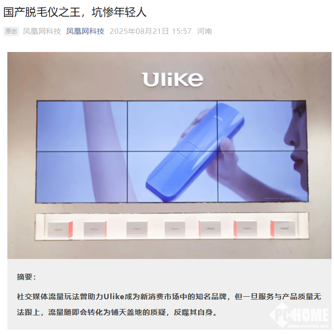 2025年8月21日消息,据凤凰网科技报道,今年618大促期间,东北女生代代在直播间购入了一台“Ulike脱毛仪”,打算解决自己身上的体毛困扰。但她与不少用户一样,使用Ulike产品后,遭遇了皮肤红痒、灼伤等副作用。
