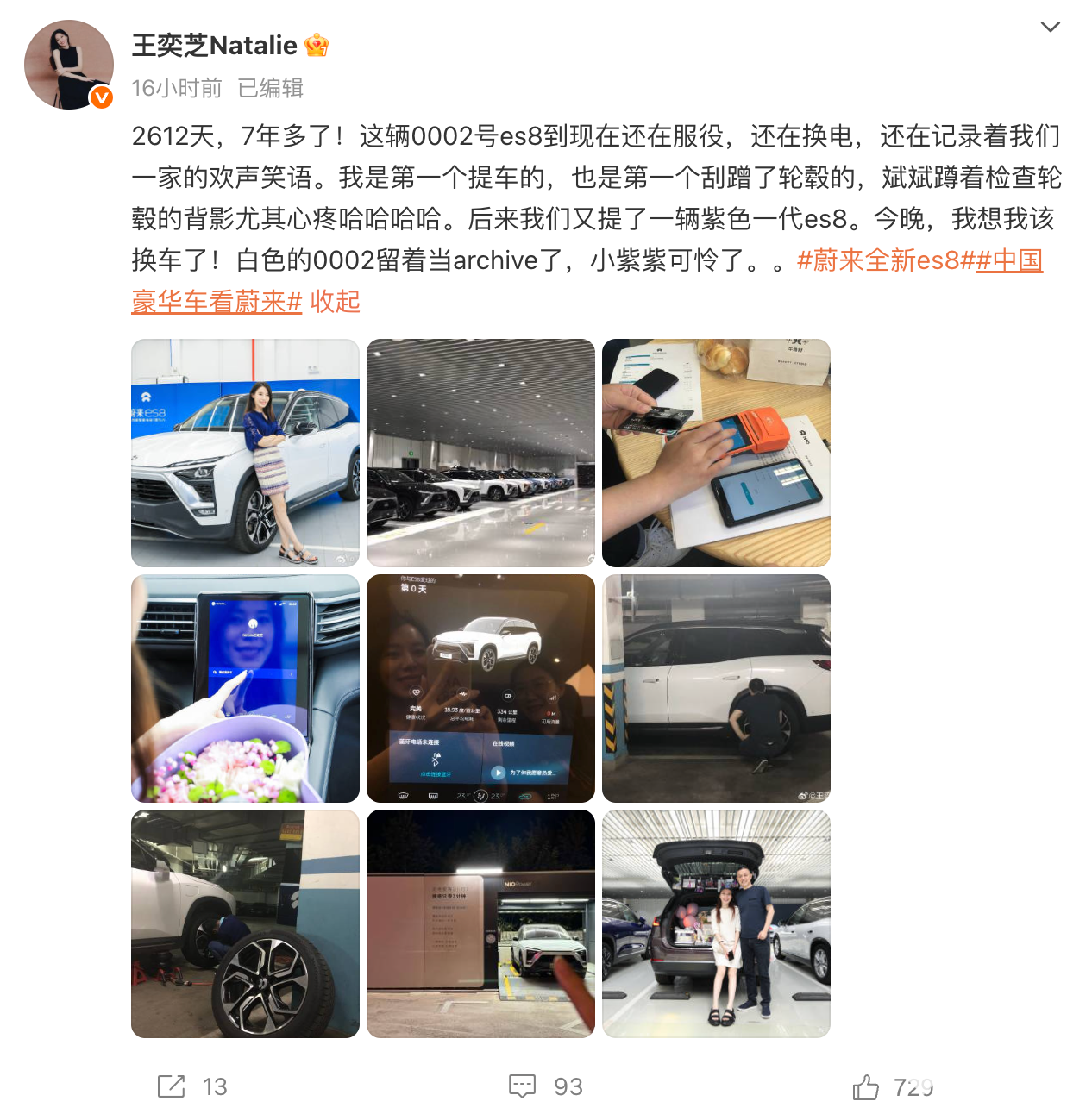 全新蔚来ES8产品技术发布会后,蔚来CEO李斌的妻子王奕芝在社交媒体平台发文称,2612天,7年多了。0002号蔚来ES8到现在还在服役,还在换电,还在记录着我们一家的欢声笑语。