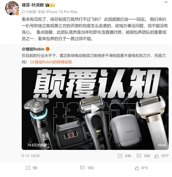 8月16日,叶洪新转发楼斌的测评视频表示,“看来有瓜吃了,徕芬剃须刀竟然打不过飞科?此视频我们会一一回应。我们来扒一扒号称独立客观第三方的评测机构是怎么收费的,收钱办事没问题,但不能没有良心”。此外,叶洪新还阴阳怪气地表示,“此团队竟然是当年和罗永浩直播对质心。被指包养团队的重要成员之一,看来包养的日子一直过得不错。”