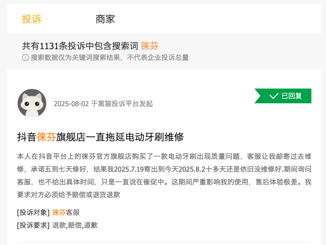 更令人担忧的是,价格战背后潜藏的品质风险正在显现。在消费服务平台黑猫投诉以“徕芬”为关键词检索,可以发现1131条投诉,诸多消费者均控诉称,徕芬吹风机、电动牙刷质量不佳,且售后不作为。