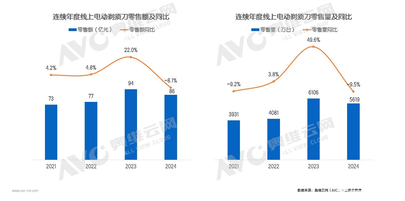 与吹风机市场正蓬勃发展形成截然反差,剃须刀市场红利正逐步收窄。奥维云网数据显示,2024年,中国电动剃须刀线上零售量仅5619万台,同比降低9.5%,零售额86亿元,同比降低8.1%。
