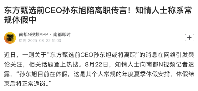 2025年8月22日,《鞭牛士》独家爆料称,前东方甄选CEO孙东旭目前已进入休假状态,或将于近期离职。针对该传闻,知情人士向南都N视频记者表示,“孙东旭目前在休假,这是其个人常规的年度夏季休假安排,休假结束后将正常返岗。”
