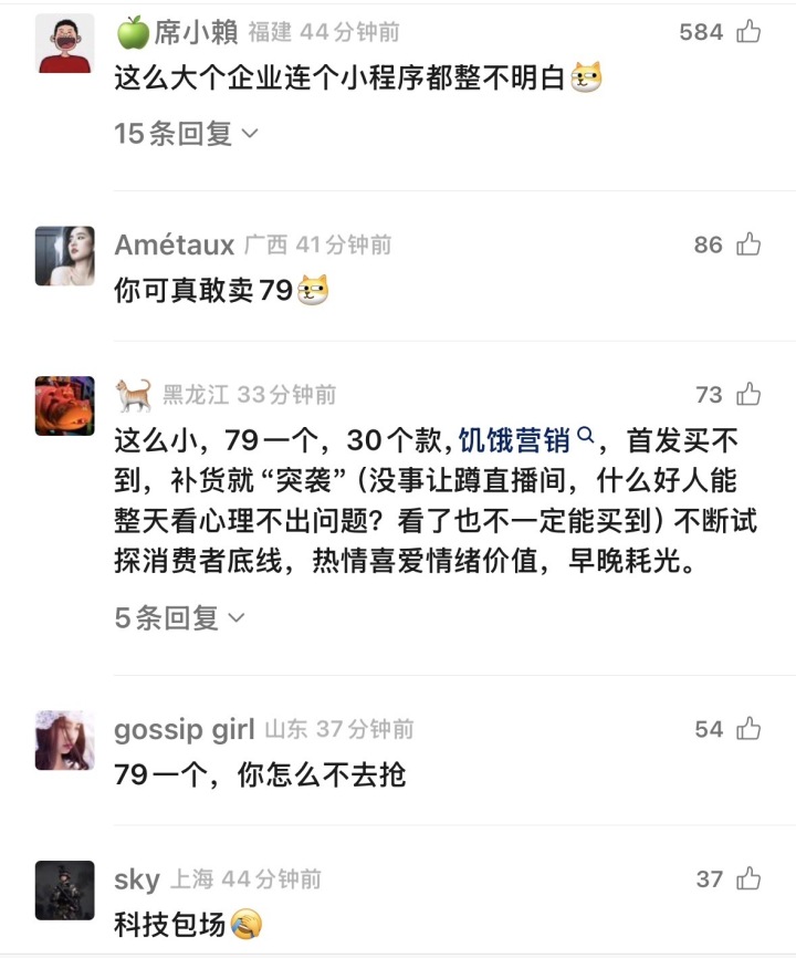 ·发售机制:泡泡玛特采用“突袭式”补货,要求用户持续关注直播间,被批为“饥饿营销”,实际购买体验较差,令消费者始终在“抢购”与“高价二手货”中徘徊动荡。