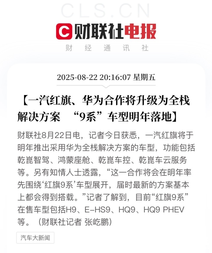 8月22日,据财联社报道,一汽红旗计划在2026年推出的新车型中搭载华为全栈解决方案,该方案覆盖智能汽车核心功能,具体包含乾崑智驾系统(高阶智能驾驶)、鸿蒙智能座舱(交互系统)、乾崑车控系统(车辆控制)和乾崑车云服务(云端数据服务)等关键模块。