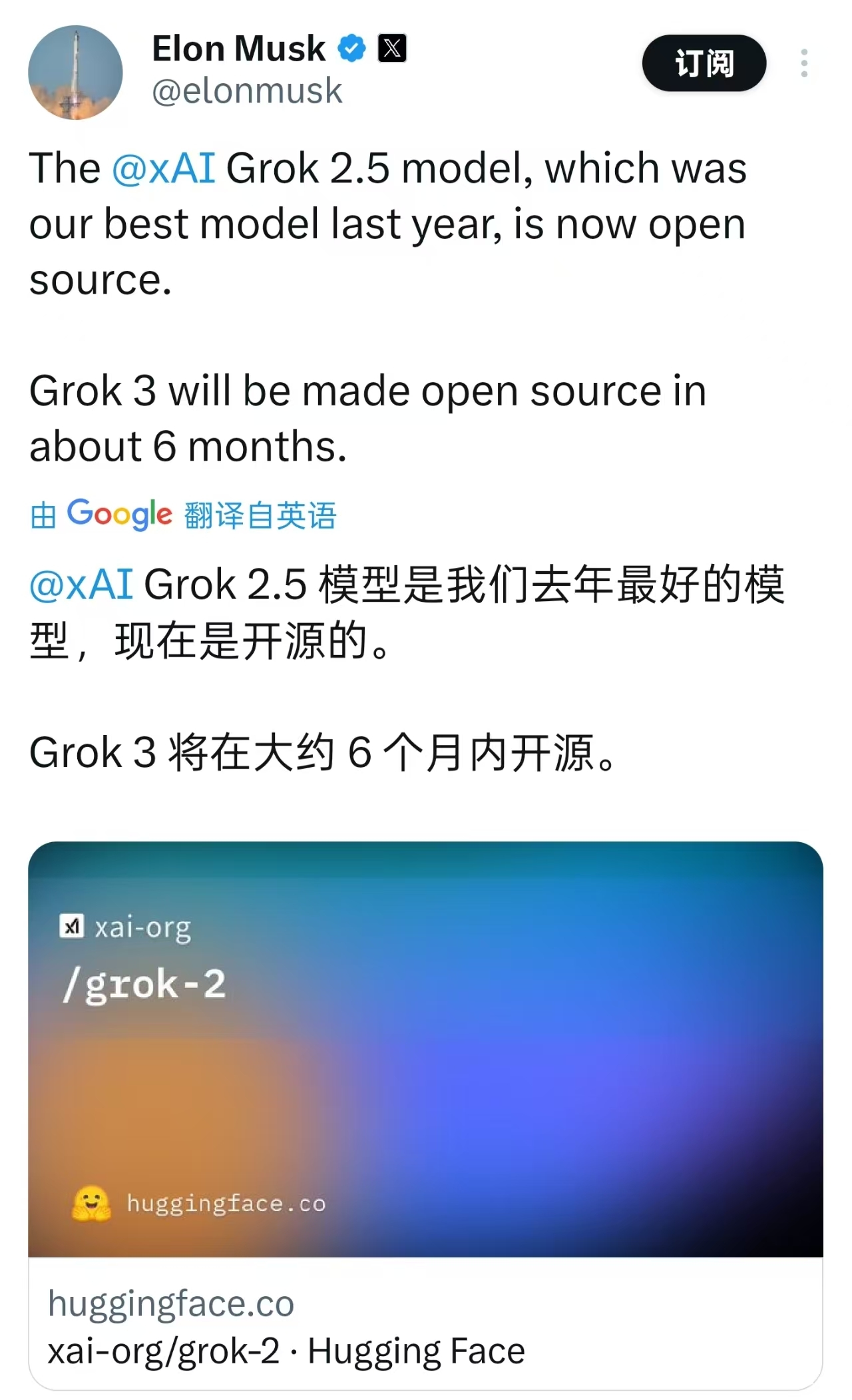8月24日,特斯拉创始人兼CEO埃隆・马斯克在海外社交平台X上发帖表示,其旗下人工智能初创公司xAI已将Grok2.5模型开源,并计划在约六个月后开源下一代模型Grok 3。