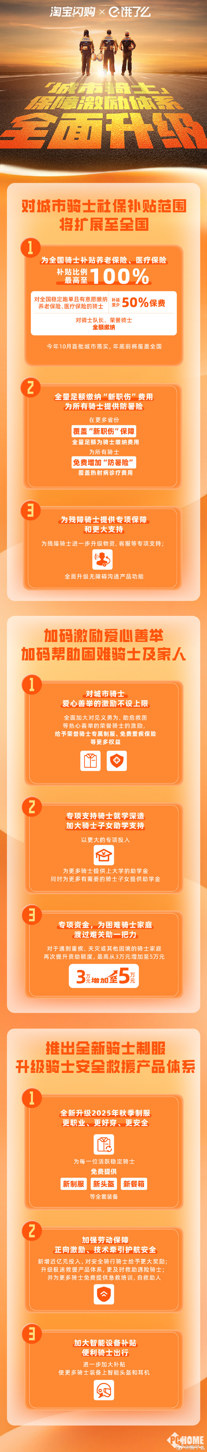 8月25日,饿了么与淘宝闪购联合宣布,城市骑士社保补贴范围将扩展至全国。这意味着,全国的骑士们将获得养老保险、医疗保险补贴,补贴比例最高可达100%。