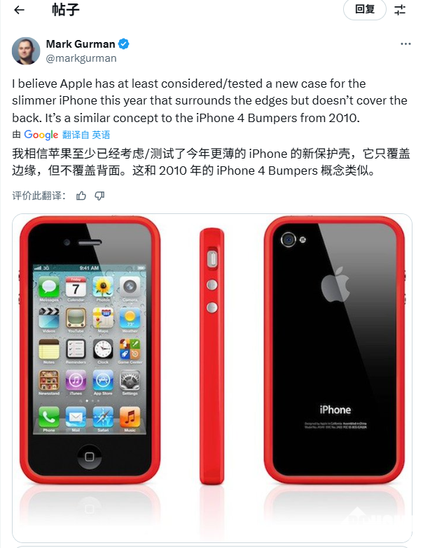 8月24日,彭博新闻社记者马克・古尔曼(Mark Gurman)在海外社交平台X发文称,苹果公司可能重新启用2010年iPhone 4所采用的“边框式”Bumper保护壳设计,并将其应用于今年推出的iPhone 17系列。
