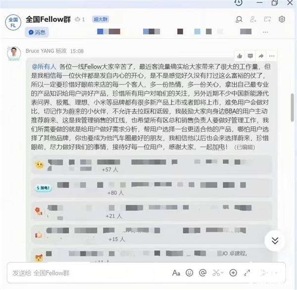 杨波还表示,“最近客流量激增,大家好久没打过这么富裕的仗,及时用户最后选择了其他品牌,但我相信他以后也会来选择蔚来,珍惜眼前,尽力做好我们的事情,接待好每一位用户,感谢大家,一起加电!”