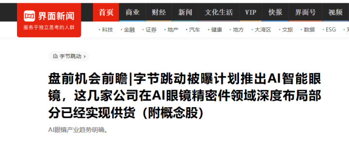 公开信息显示,今年4月14日,界面新闻曾就字节跳动开发AI智能眼镜一事进行报道,内容提及字节跳动正计划推出自研AI智能眼镜,但尚未确定该产品的上市时间及销售地区;另有知情人士透露,字节跳动预计将在这款智能眼镜中,搭载类似其自研AI模型“豆包”的相关功能。