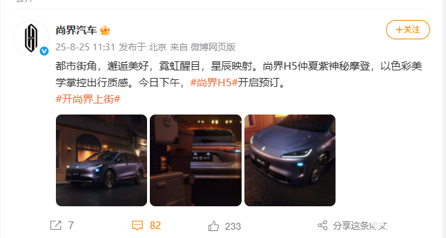 8月25日,尚界汽车官方今日宣布尚界H5正式开启预订,预售价16.98万起。即刻预订,享10000元尚等好礼,并且额外解锁至高3000元权益。