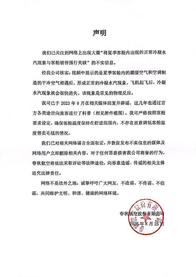 春秋航空表示,他们已于2023年8月在相关媒体回复并辟谣,这几年也通过官方各类途径向旅客进行了科普。目前,春秋航空已对网络谣言进行了全面取证,对于损其商誉的行为,将采取诉讼等法律途径追究责任。