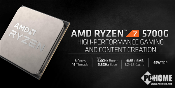 锐龙7 5700G 8核心16线程,二级缓存4MB,三级缓存16MB,基准频率3.8GHz,最高加速4.6GHz,集成Vega 8 GPU,频率2.0GHz。
