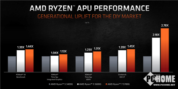 性能方面,请参考我们的首发评测,而在官方对比中,相较于上一代的锐龙5 3400G,锐龙5 5600G、锐龙7 5700G单核性能可以高出40%左右,多核性能则高出1.2-1.8倍左右,GPU性能在核心单元不变、频率稍有降低的情况下,反而还略有提升。