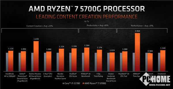 对比竞品,锐龙7 5700G的钦定对手是i7-11700(其实也能打i7-11700K),内容创作、生产力、基准性能分别平均领先23%、16%、31%,游戏性能更是秒杀。