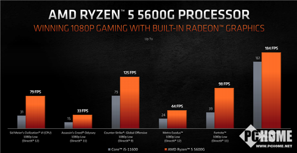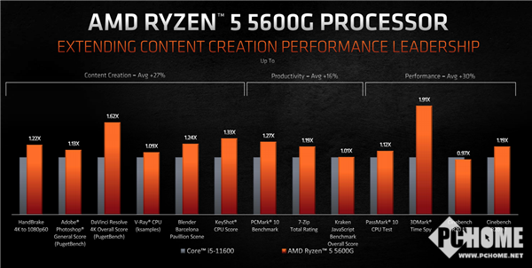 锐龙5 5600G则对标i5-11600(或者i5-11600K),内容创作、生产力、基准性能分别平均领先27%、16%、30%,游戏性能自然也是欺负人。