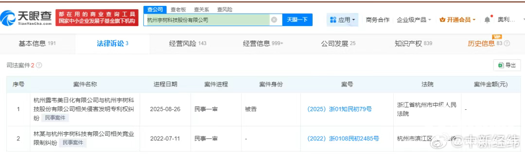 8月26日,天眼查显示,杭州宇树科技股份有限公司新增一起侵害发明专利权纠纷诉讼。原告为杭州露韦美日化有限公司,案件将于今日在杭州市中级人民法院开庭审理。