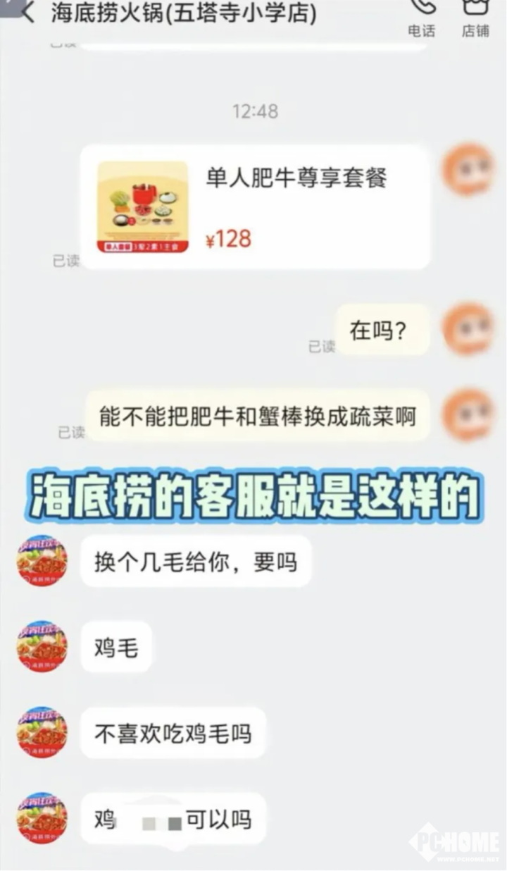 网友在外卖平台下单了一份“单人肥牛尊享套餐”,询问海底捞客服,能否将肥牛和蟹棒换成蔬菜。结果,海底捞客服却回复“换个鸡毛给你,要吗”等带有侮辱性词汇的回复。据悉,涉事门店为海底捞火锅五塔寺小学店。