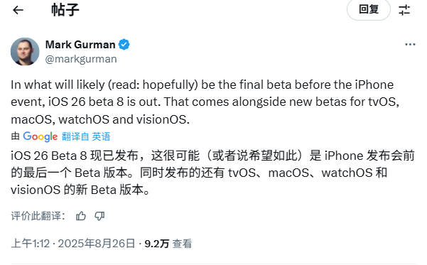 科技记者古尔曼预测,这很有可能是iPhone 17发布前的最后一个开发者测试版。