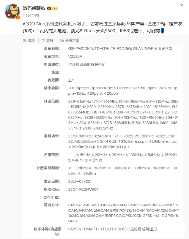 推测此次新品或为iQOO Neo 11,据此前爆料,新品全系将配备2K国产屏幕、金属中框、超声波指纹识别以及百瓦级闪充与大容量电池。处理器方案包括骁龙8 Elite和天玑9500两种平台。IP68级别防尘防水目前仍在评估中,尚未最终确定。