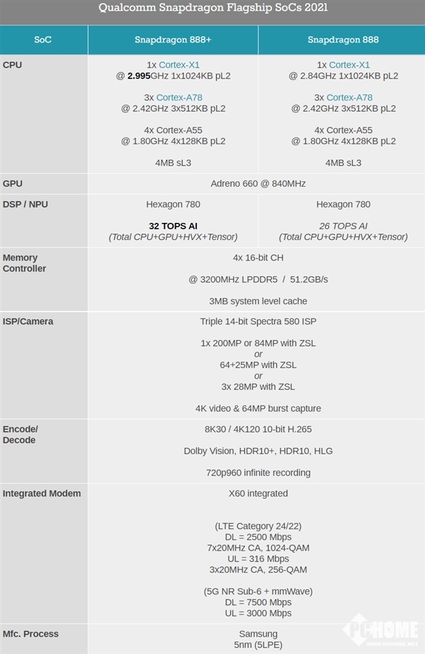 从外媒制作的规格对比图来看,相比骁龙888,骁龙888 Plus最主要的升级就是Cortex-X1大核主频从2.84GHz提升到了3GHz,预计性能将有5%左右的提升。