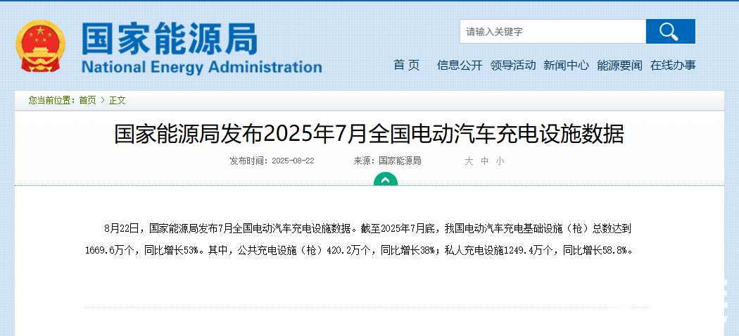 国家能源局最新发布的数据显示,截至2025年7月底,我国电动汽车充电基础设施总数已达1669.6万个,同比增长53%。其中,公共充电设施420.2万个,同比增长38%;私人充电设施1249.4万个,同比增长58.8%。