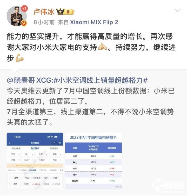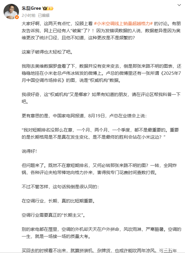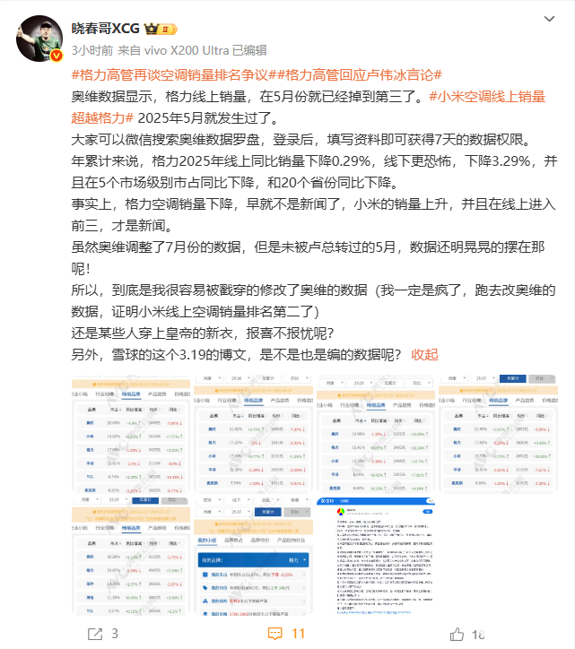 8月26日,博主“晓春哥XCG”今日在社交媒体平台上发文,再次回应格力与小米空调销量的争议,并表示,奥维数据显示,格力空调的线上销量,在5月份就已经掉到第三了。小米空调线上销量超越格力,2025年5月就发生过了。