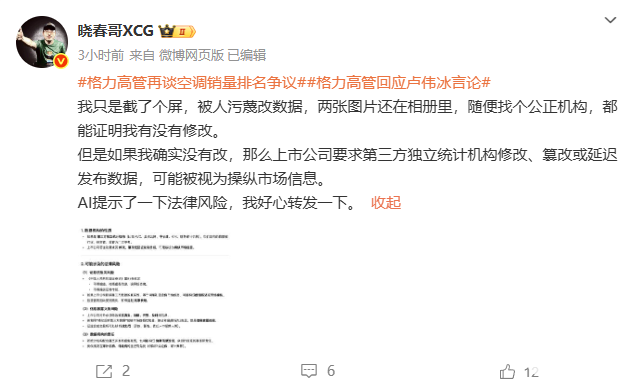 随后朱磊昨日又发文表示,奥维数据罗盘的数据并没有变来变去,并且那张来路不明的图表,还稳稳地挂在卢伟冰转发的微博上。并且称卢伟冰转发来路不明截图,害得格力专门花费时间查数打假。