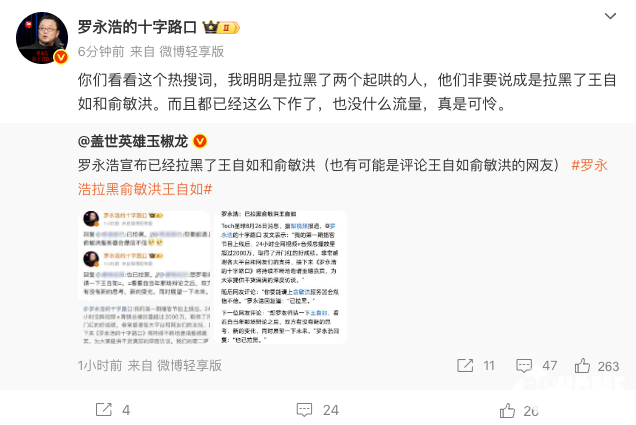随后,微博出现了“罗永浩拉黑俞敏洪王自如”的热搜话题。对此,罗永浩表示,“你们看看这个热搜词,我明明是拉黑了两个起哄的人,他们非要说成是拉黑了王自如和俞敏洪。而且都已经这么下作了,也没什么流量,真是可怜。”由此来看,罗永浩并没有真正拉黑俞敏洪、王自如,而是仅仅拉黑了两个起哄的网友。