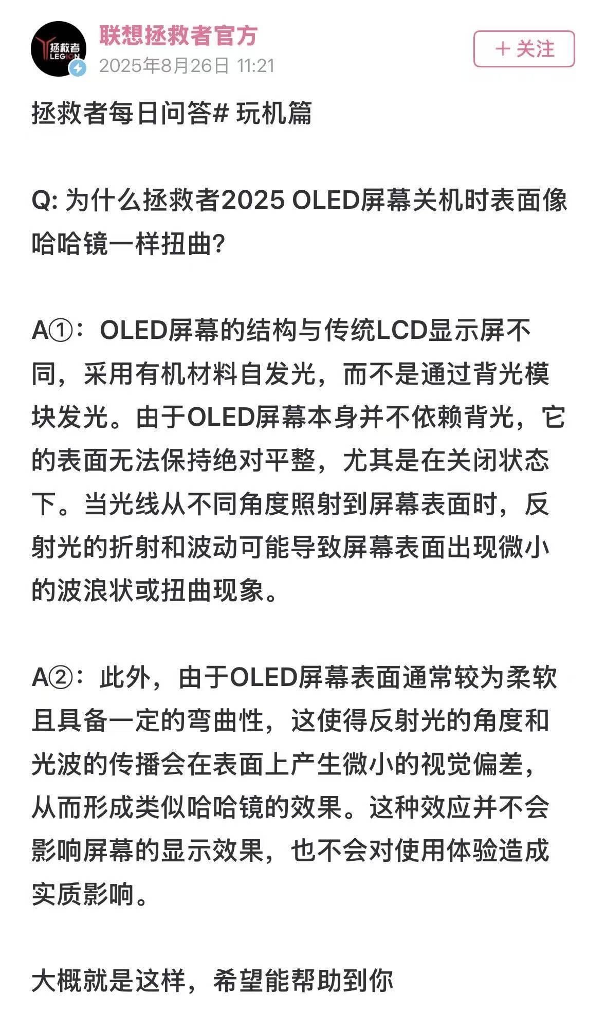 同时,官方补充指出,OLED屏幕表面通常较柔软并具备一定的弯曲性,光线在反射过程中容易产生细微的视觉偏差,从而导致用户观察到类似“哈哈镜”的现象。联想强调,这种现象仅限于关机状态下的光学反射效应,不会影响屏幕的正常显示效果,更不会对用户的实际使用造成功能性影响。