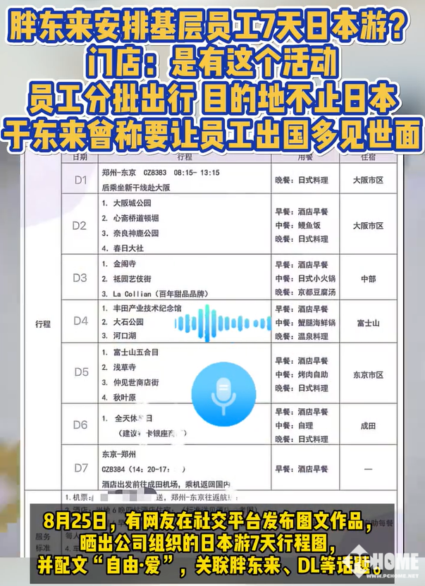 近日,有网友在社交平台发布图文内容,展示了一份7天日本游行程单,并配文“自由·爱”,图文中所带话题有胖东来及DL等标签。随后该网友在评论区解释称,此次出行是胖东来针对基层员工组织的团建活动,所有费用均由公司承担。