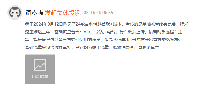 此次集体投诉,多名车主指出,吉利汽车此举涉嫌虚假宣传,单方面变更服务条款,损害消费者权益,要求吉利汽车尊重协议,恢复原有服务承诺。