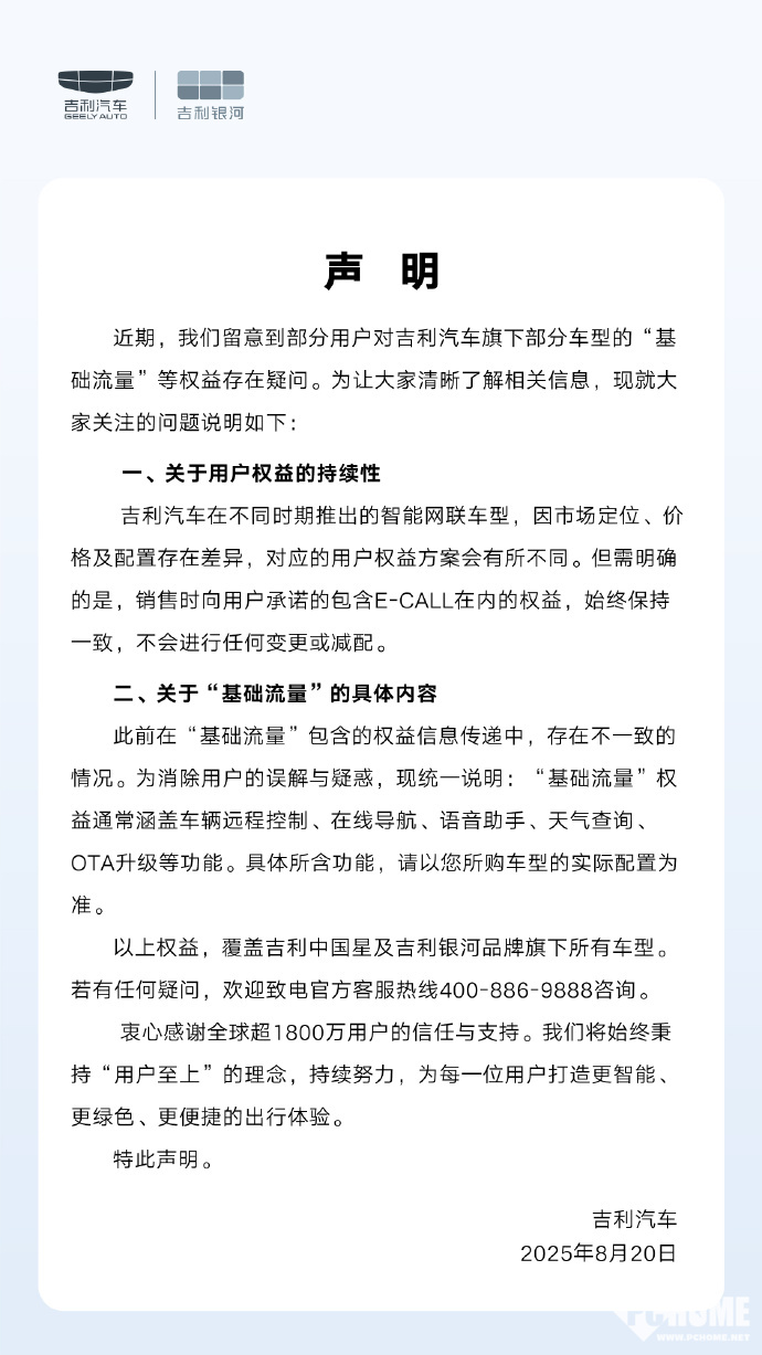 据悉,吉利汽车曾在8月20日发布声明回应部分车型“基础流量”等权益的疑问。