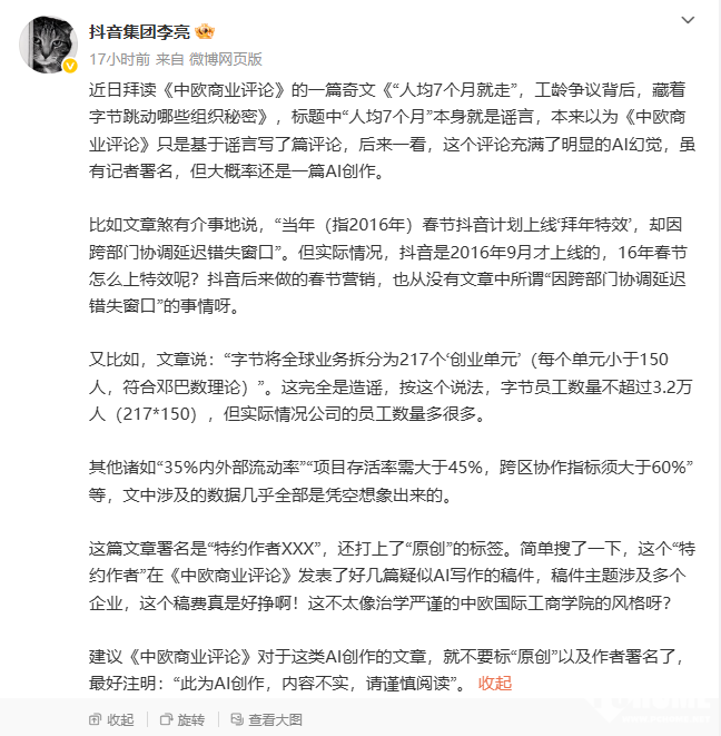 8月26日,抖音集团副总裁李亮在微博发文,批判《中欧商业评论》当日发布的《“人均7个月就走”,工龄争议背后,藏着字节跳动哪些组织秘密》一文。他指出,标题中“人均7个月”本身系谣言,且该文章充斥明显AI幻觉,大概率为AI创作,并“建议”《中欧商业评论》:若文章由AI创作,最好注明“此为AI创作,内容不实,请谨慎阅读”。