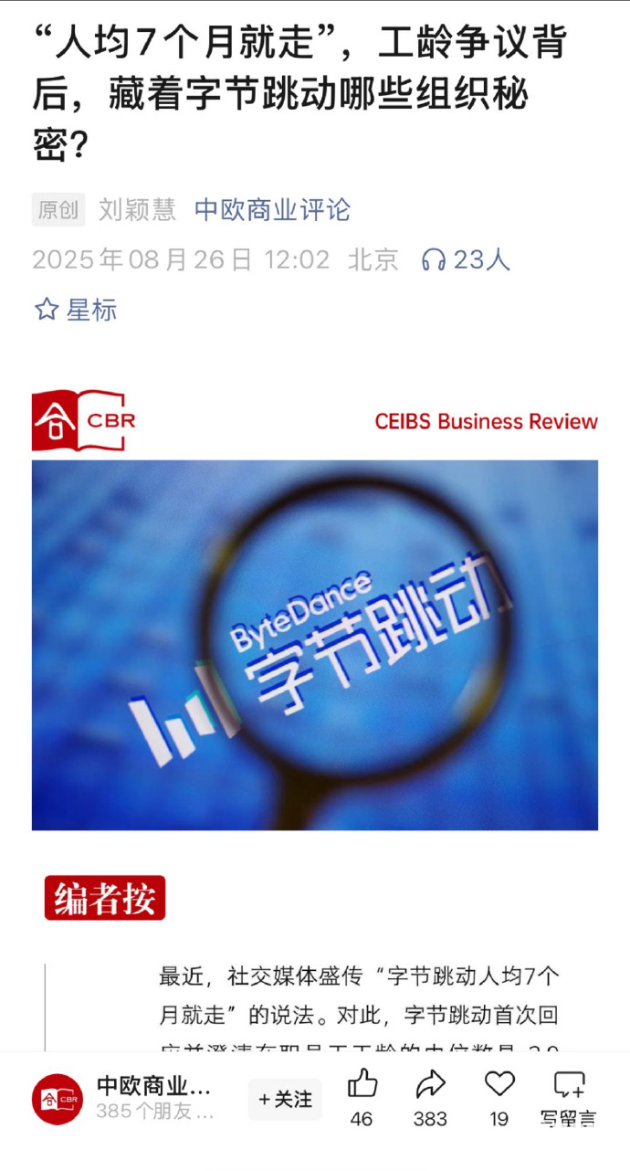 8月26日,抖音集团副总裁李亮在微博发文,批判《中欧商业评论》当日发布的《“人均7个月就走”,工龄争议背后,藏着字节跳动哪些组织秘密》一文。
