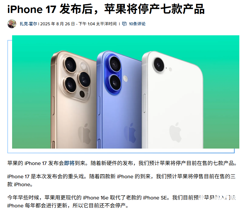 8月27日,苹果今日官宣iPhone 17发布会将于北京时间9月10日凌晨1:00举行。随着新品发布,外媒9to5mac预测,苹果将停售七款产品,相关话题登上微博热搜。