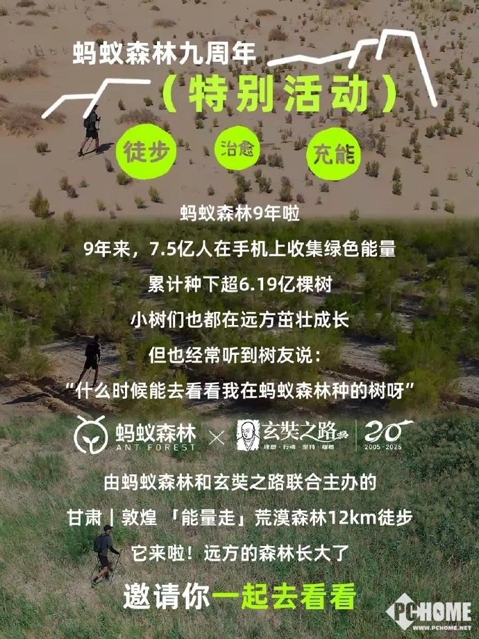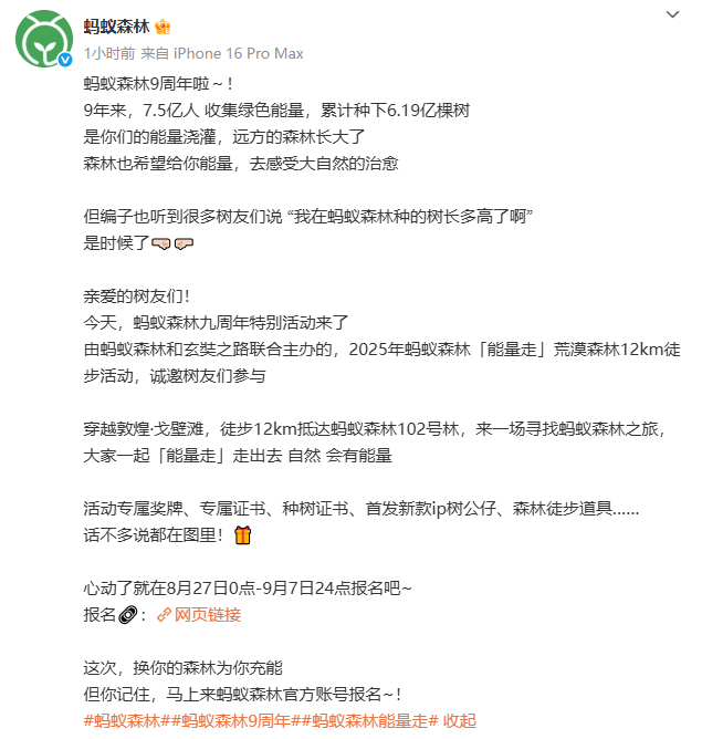 数据显示,蚂蚁森林在内蒙古、甘肃等13省份,种植总面积达655万亩,约为乌兰布和沙漠面积一半,相当于62万个标准足球场。从陆地生态修复,到生物多样性保护,再到海洋生态保护项目,蚂蚁森林已支持全国25个省份生态建设。同时蚂蚁森林也宣布了九周年特别活动,由蚂蚁森林和玄奘之路联合主办的,2025年蚂蚁森林“能量走”荒漠森林12km徒步活动,诚邀树友们参与。