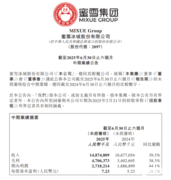 8月27日,蜜雪集团公布了截至2025年6月30日的中期业绩报告。报告数据显示,蜜雪集团上半年展现出强劲的增长态势:实现收入148.7亿元,同比增长39.3%;毛利47.1亿元,同比增长38.3%;净利润为27.2亿元,同比增长幅度达44.1%。