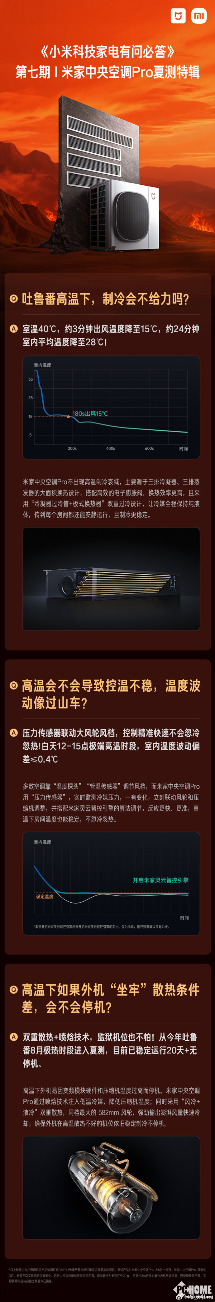 针对外机在高温散热不良环境下易停机的情况,该机型引入喷焓技术,通过注入低温冷媒降低压缩机温度,并采用“风冷+液冷”双重散热方案,同时配备582毫米大风轮以增强散热能力。小米称自今年8月进入吐鲁番极热天气测试以来,米家中央空调Pro已连续稳定运行超过20天未出现停机。