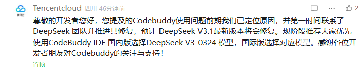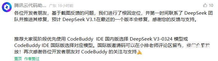 目前,根据官方的最新回复:此次问题是由DeepSeek V3.1模型引入的bug,官方已将问题上报,后续会在最新版本进行修复。
